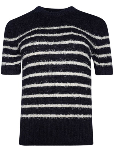 navy/cream silk-cashmere blend knitted construction horizontal stripe pattern crew neck short sleeves straight hem