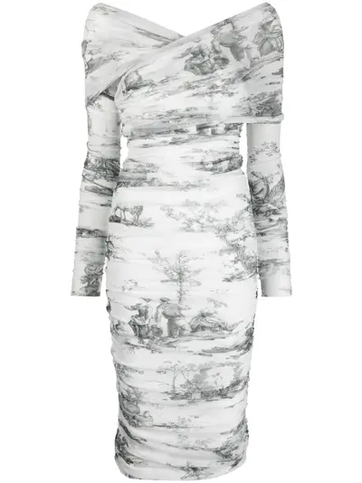 white black gathered detailing all-over graphic print off-shoulder long sleeved mid-length
