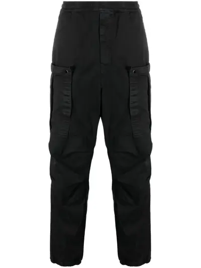 black stretch-cotton signature Compass motif logo patch to the side gathered detailing mid-rise elasticated waistband straight leg two front cargo pockets two side slit pockets rear stud-fastening pocket elasticated ankles