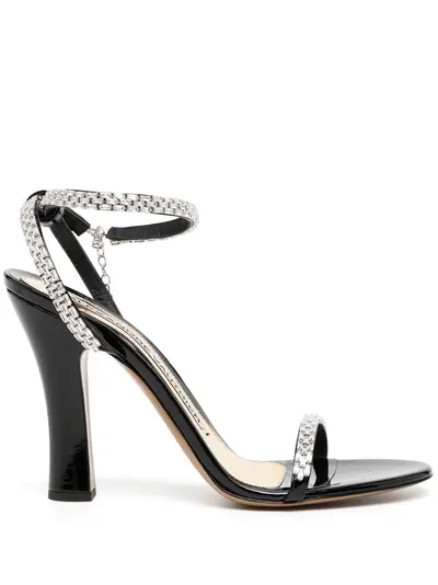 black leather crystal embellishment open toe single toe strap ankle strap lobster claw fastening branded leather insole high block heel leather outsole
