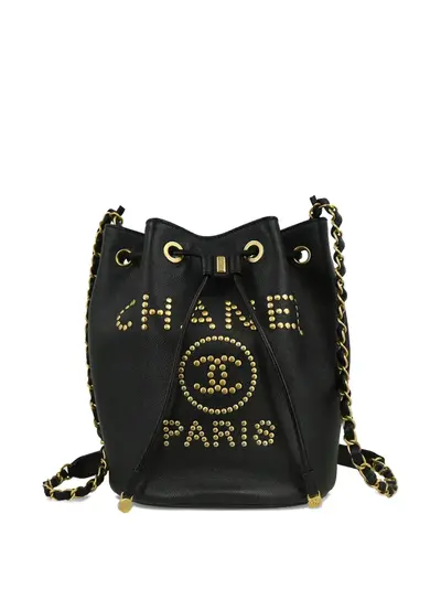 circa 2019 black calf leather studded logo detail signature interlocking CC logo leather and chain-link shoulder strap drawstring fastening main compartment gold-tone hardware Serial Number:28249539 Condition: GOOD. This previously owned and used item is in good condition with minimal signs of use. This may include fading of material or plating and scratches.