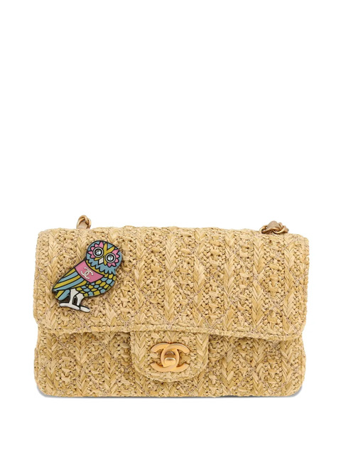 beige raphia exterior owl emblem logo clasp chain strap flap top
