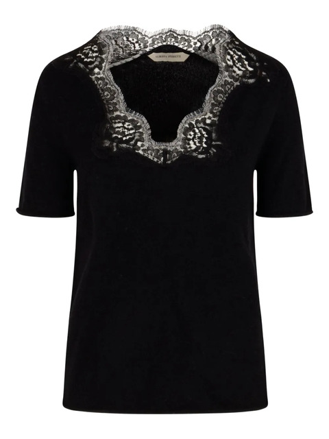 black short sleeves virgin wool-blend V-neck lace neckline-insert