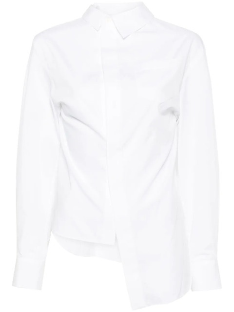 white poplin texture asymmetric design box-pleat detail classic collar concealed front button fastening long sleeves buttoned cuffs chest patch pocket high-low hem
