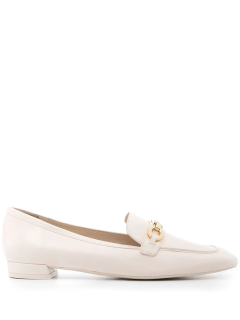 eggshell white calf leather grained texture almond toe gold-tone logo plaque branded leather insole leather lining low block heel rubber sole slip-on style This piece comes complete with a protective dust bag.