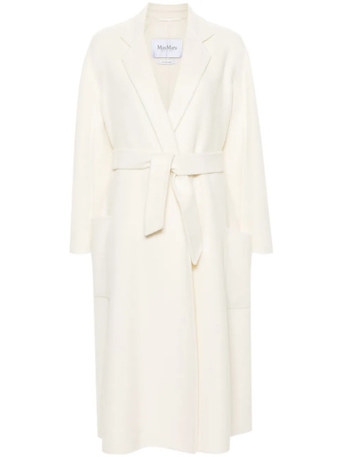 cream white cashmere felted finish wide notch lapels detachable and adjustable waist belt drop shoulder long sleeves two patch pockets mid-calf length straight hem unlined