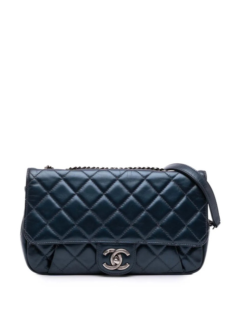 quilted calfskin body leather woven chain straps front flap with interlocking Cs closure with pleated front exterior interior zip and slip pockets blue Serial Number: 22087134 This item has no inclusions. Condition: GOOD. This previously owned and used item is in good condition with minimal signs of use. This may include fading of material or plating and scratches. Please refer to the photos on this product page for a detailed view of the item, including any damages declared.