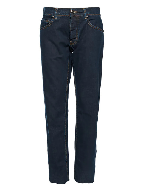 dark blue five-pocket style contrast stitching button fastening zip fly Condition: GOOD. This previously owned and used item is in good condition with minimal signs of use. This may include fading of material or plating and scratches.