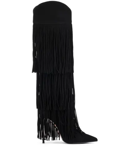 black calf suede pointed toe stiletto heel tiered fringes knee-high shaft