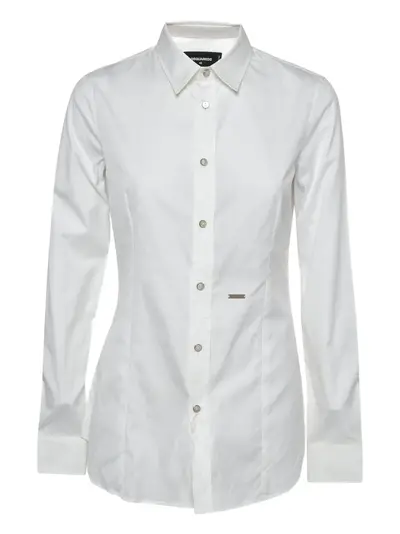 white cotton front button fastening long sleeves buttoned cuffs curved hem Condition: GOOD. This previously owned and used item is in good condition with minimal signs of use. This may include fading of material or plating and scratches.