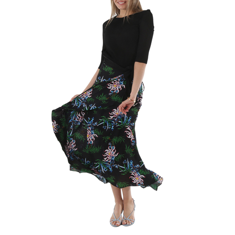 Kenzo Ladies Bottoms. SKU: FA52JU12958F-99. Color: Black. Kenzo Black Botanical Print Wrap Skirt. Black and multicoloured botanical-print wrap skirt featuring a high rise, an asymmetric style, a ruffle trimming, a tie waist, a concealed side zip fastening and a floral print. Lining Polyester 100%.Outer Viscose 100%.