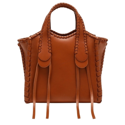 Chloe Ladies Crossbody. SKU: CHC23AS590L02-247. Color: Caramel. The Mony Small Tote Bag by Chloe is a refined everyday companion, crafted from smooth caramel-coloured calfskin and accented with tone-on-tone topstitching for a subtle, sophisticated finish. Its structured silhouette is enhanced by dual top handles adorned with hanging leather straps, adding a touch of effortless elegance. The zip-top closure secures your essentials, while the suede-lined interior features a flat leather pocket for easy organization. 100% Calfskin Leather, 100% Suede. Made in Italy.