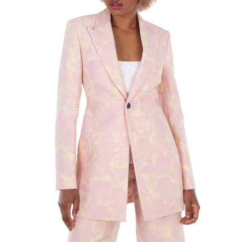 Burberry Ladies Outerwear. SKU: 8082349. Color: Cameo Ip Pattern. Burberry Rose Wool Tailored Jacket. This jacket is crafted from a wool-silk jacquard fabric, featuring a single-breasted button closure, peak lapels, and a single vent. It has long sleeves, is fully lined, and boasts a half-canvas construction with padded shoulders. Outer: 98% wool, 2% silk, Undercollar: 50% viscose, 50% wool, Lining: 100% viscose. Made in Italy.