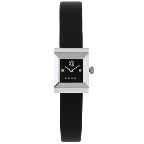 Silver-tone stainless steel case with a black leather strap. Fixed silver-tone stainless steel bezel. Black dial with silver-tone hands and Roman numeral hour markers. Dial Type: Analog. Quartz movement. Scratch resistant sapphire crystal. Square case shape, case size: 14 mm, case thickness: 6 mm. Band width: 9 mm, band length: 7.5 inches. Buckle clasp. Water resistant at 30 meters / 100 feet. Functions: hour, minute. G-frame Series. Fashion watch style. Gucci G-Frame Quartz Black Dial Ladies Watch YA128538.