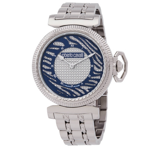 Stainless steel case with a stainless steel bracelet. Fixed stainless steel bezel. Silver and blue dial with silver-tone hands and Roman numeral hour markers. Dial Type: Analog. Quartz movement. Scratch resistant antireflective sapphire crystal. Pull / push crown. Solid case back. Round case shape. Case size: 38 mm. Band length: 7.5 inches. Deployment clasp. Water resistant at 50 meters / 165 feet. Functions: hour, minute. Casual watch style. Roberto Cavalli Silver Dial Stainless Steel Ladies Watch RV1L056M0046.