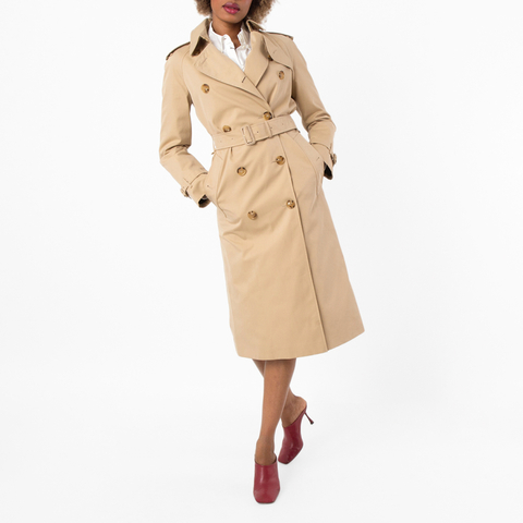 Burberry Ladies Outerwear. Fashion category: Coats & Jackets. SKU: 8064775. Color: Honey. Burberry Monogram Motif Waterloo Trench Coat. A timeless Waterloo trench coat showcasing a double-breasted closure, button-through welt pockets, and a back button-through vent. Designed with classic trench details, including epaulettes, a hook-and-eye collar closure, a gun flap, belted cuffs, a D-ring belt, and a storm shield. The contrast jacquard-woven lining features a pixelated Thomas Burberry Monogram, while the back is emblazoned with a bold Creeper graphic embroidery. 100% Cotton. Made in Italy.