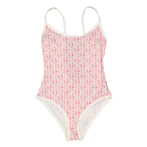 Moncler Ladies Swim. SKU: I10938N0000589A0Y519. Color: Pink. Moncler Logo Print Swimsuit. This swimsuit features a repeat logo print, a closed neckline, and thin straps. The back is exposed down to the midsection, offering a sleek and modern silhouette. 83% polyamide, 17% spandex/elastane. Made in Italy.