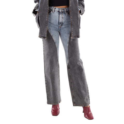 Rotate Ladies Bottoms. Fashion category: Jeans & Denim. SKU: 1128191603-MEDIUM BLUE DENIM. Color: Medium Blue Denim. Rotate Ladies Medium Blue Denim Straight Patchwork Jeans. Crafted from organic cotton, these pants feature a patchwork design with contrasting blue and dark grey denim for a modern twist. They include belt loops, a five-pocket design with hard rivet accents, a logo patch on the back, and a logo jacron on the patch. The pants have a straight cut, hidden closure, and button for a sleek finish. 100% COTTON (ORGANIC).