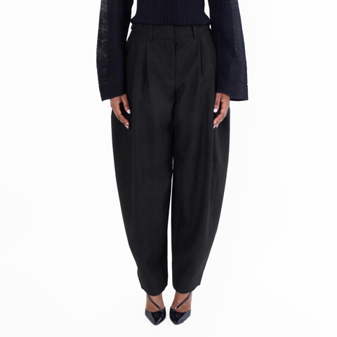 Stella McCartney Ladies Bottoms. Fashion category: Pants & Leggings. SKU: 6401383CU7501000. Color: Black. Stella McCartney Ladies Black Pleated Wide-Leg Wool Trousers. A pair of wool trousers featuring a wide leg, pleat detailing, and decorative-button waist tabs. They have a mid-rise, hook and zip fly fastening, two side inset pockets, and two rear jetted pockets. Wool 100% Made in Italy.