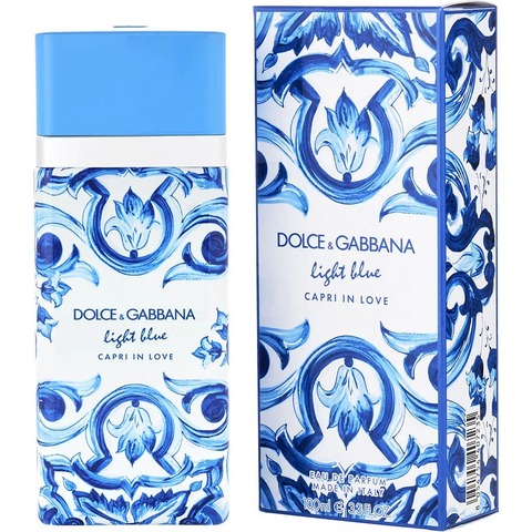 Launch year: 2025. Top notes: Lemon, Crisp apple, Jasmine tea. Heart notes: White flowers, Powdery accords, Longoza. Base notes: Cedarwood, Musk, Amber accents. Design house: Dolce and Gabbana. Design house category: fashion. Design house country: Italy. Scent name: Light Blue Capri In Love. Gender: Ladies. Category: Fragrance. SubType: EDP Spray. Size: 3.4 oz. Barcode: 8054754407235. Dolce and Gabbana Ladies Light Blue Capri In Love EDP Spray 3.4 oz Fragrances 8054754407235. <br/><br/> This item is only valid for shipment in the Contiguous United States & Canada.