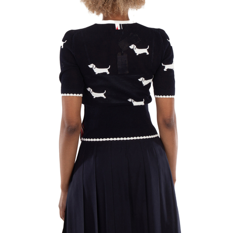 Thom Browne Ladies Tops. Fashion category: Shirts & Blouses. SKU: FKA444A Y3006 415. Color: Navy. Thom Browne Cotton Pointelle Intarsia Hector Knit Top. This tailored top, inspired by Thom Browne's iconic dachshund muse Hector, features button side vents with signature striped grosgrain trim, a matching grosgrain loop tab, and a classic crew neckline, all adorned with the brand's signature emblems. 99% Cotton, 1% Polyamide. Made in Italy.