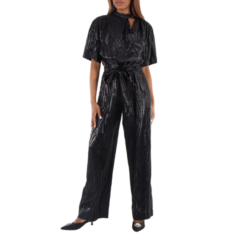 Stella McCartney Ladies Tops. Fashion category: Jumpsuits & Rompers. SKU: 6100533CJ3021000. Color: Black. Stella Mccartney Ladies Black Woodgrain Print Lurex Jumpsuit. Crafted from our forest-friendly viscose, this jumpsuit showcases a tonal metallic Lurex woodgrain-inspired print. It features a crew neck band with a split, short sleeves, an elasticated waistband, button fastening at the back, a detachable belt with belt loops, and wide legs.
