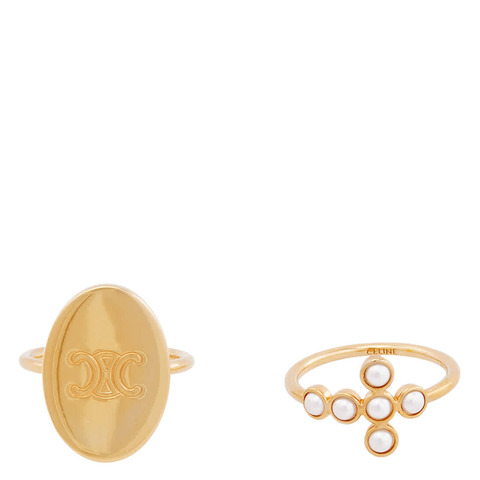 Celine Ladies Rings. SKU: 460QO6PRB01GI. Color: Gold / Ivory. The Celine Triomphe Folk Rings set embodies effortless elegance with a touch of vintage charm. Crafted from brass with a luxurious gold finish, each ring is adorned with delicate ivory resin pearls, creating a refined contrast. Designed as a set of two, these rings can be worn together for a layered look or separately for subtle sophistication. A timeless addition to any jewelry collection, they showcase Celines signature blend of classic and contemporary style. Made in Italy.