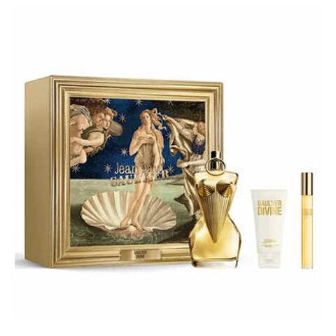 Launch year: 2023. Fragrance Family: Amber Floral. Top notes: Calypsone, Red berries, Bergamot. Heart notes: Lily, Jasmine, Ylang-ylang. Base notes: Meringue, Musk, Patchouli. Design house: Jean Paul Gaultier. Design house category: fashion. Design house country: France. Scent name: Divine. Gender: Ladies. Category: Fragrance. SubType: Gift Set. Barcode: 8435415098908. Edp100+Bl75+Mg10Ml. Jean Paul Gaultier Ladies Divine Gift Set Fragrances 8435415098908. <br/><br/> This item is only valid for shipment in the Contiguous United States & Canada.