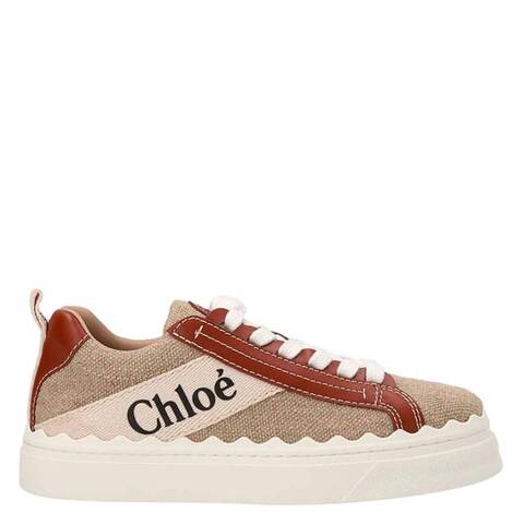 Chloe Ladies Sneakers. SKU: CHC22U108Z490U. Color: White/Brown. Chloe Linen And Leather Lauren Sneakers. Crafted from a linen and leather upper, this pair of Lauren sneakers features a low-top design, round toe, lace-up fastening, side logo print insert, rear heel pull, and a wavy rubber sole. Made in Vietnam. <br/><br/><b>Please visit the brand website for sizing information.</b>