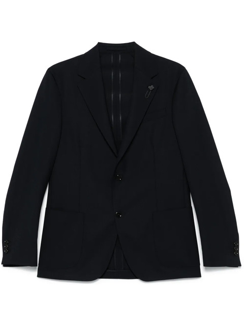 Navy blue, virgin wool. Single-breasted style with notched lapels and long sleeves. Features two front patch pockets and English rear vents. Unlined construction fastened by a front button closure.