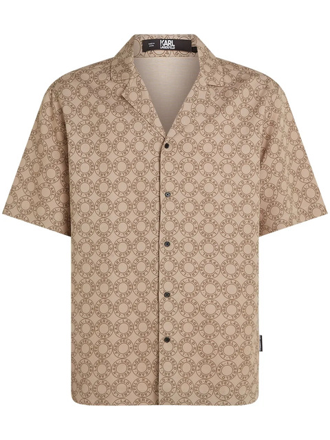 light brown all-over logo print camp collar front button fastening short sleeves straight hem