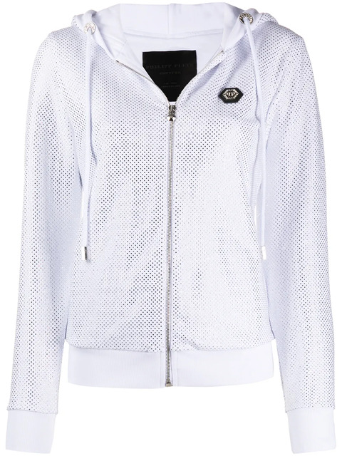 White cotton Philipp Plein TM embellished hoodie from Philipp Plein featuring a hood with drawstring tie fastenings, silver-tone hardware, rhinestone embellishments, side slit pockets, logo to the back, a ribbed hem and cuffs, a relaxed shape and signature hexagonal jewel logo at the chest.