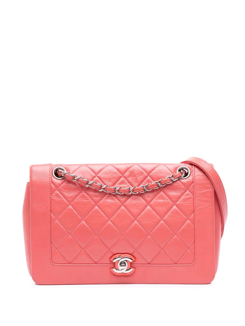 quilted crumpled calf leather body leather-woven chain link straps top flap with CC turn-lock closure exterior back slip pocket interior zip pocket pink Serial Number: 25704483 This item has no inclusions. Condition: GOOD. This previously owned and used item is in good condition with minimal signs of use. This may include fading of material or plating and scratches. Please refer to the photos on this product page for a detailed view of the item, including any damages declared.