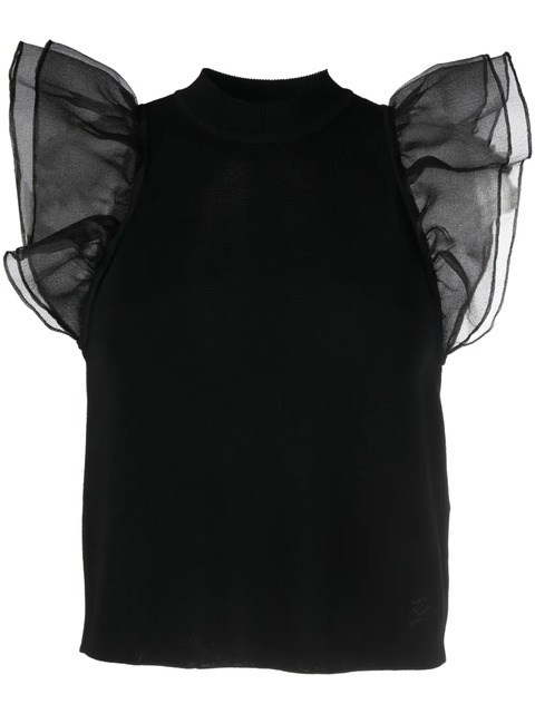 black knitted construction mock neck tulle sleeves flutter sleeves straight hem