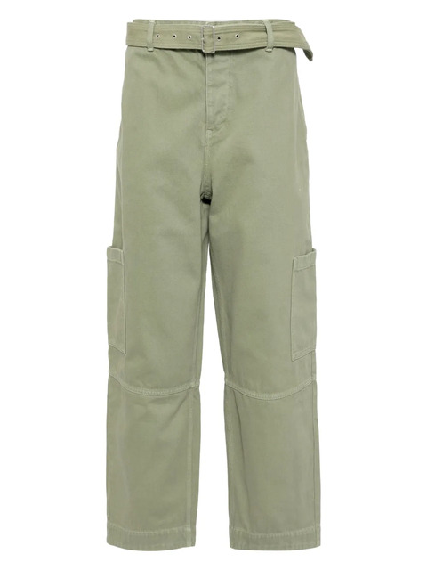 olive green concealed fly and button fastening belted waist two side slash pockets two rear patch pockets
