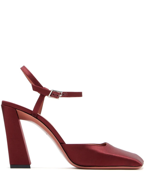 red buckle-fastening ankle strap satin finish branded heel counter high block heel