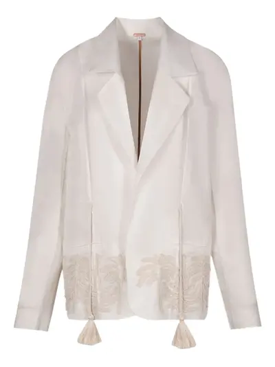 beige palm-tree embroidery tassel detail notched lapel open front long sleeves