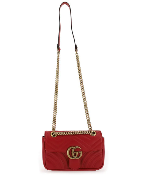 The small GG Marmont chain shoulder bag has a softly structured shape and an oversized flap closure with Double G hardware. The sliding chain strap can be worn multiple ways, changing between a shoulder and a top handle bag. Made in matelassé chevron leather with a heart on the back. Red matelassé chevron leather with a heart. Antique gold-toned hardware. Double G. Internal open pocket for larger phones. Sliding chain strap can be worn as a shoulder strap with 55cm drop or can be worn as a top handle with 30cm drop. Flap with spring closure. Mini size: W22cm x H13cm x D6cm. Microfiber lining with a suede-like finish. Made in Italy. The model is 178cm.