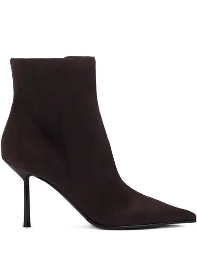 dark brown suede leather 80mm stiletto heel pointed toe back zip fastening calf-height shaft