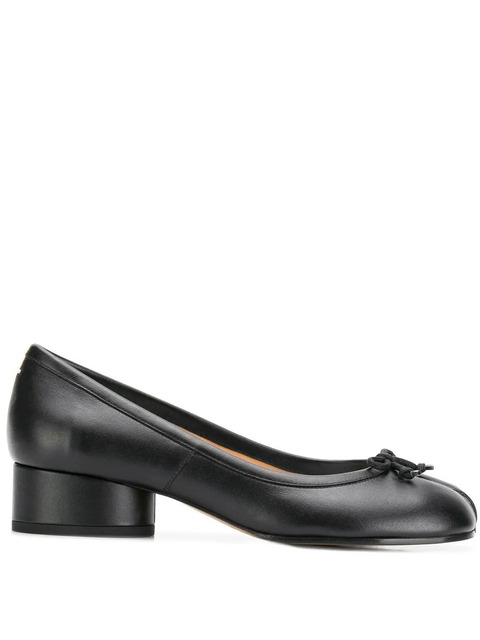 Maison Margiela redrafts its iconic tabi toe silhouette as a low-heeled ballerina pump. Crafted in Italy from soft black leather, the slip-on design features a tabi toe, a bow detail, a chunky low heel, a leather insole and a leather sole.