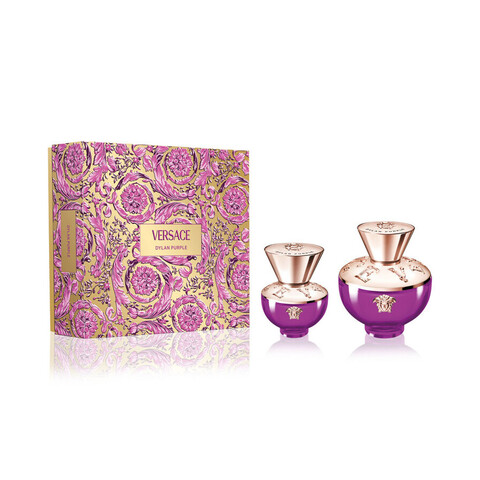 Launch year: 2022. Fragrance Family: Floral Fruity. Top notes: Pear, Bitter orange, Bergamot. Heart notes: Mahonia, Freesia, Pomarose. Base notes: Ambroxan, Iso e super, Sylkolide, Belambra tree, Virginia cedar. Design house: Versace. Design house category: fashion. Design house country: Italy. Scent name: Pour Femme Dylan Purple. Gender: Ladies. Category: Fragrance. SubType: Gift Set. Barcode: 8011003893409. EDP Natural Spray 100ml + 10ml. Versace Ladies Pour Femme Dylan Purple Gift Set Fragrances 8011003893409. <br/><br/> This item is only valid for shipment in the Contiguous United States & Canada.