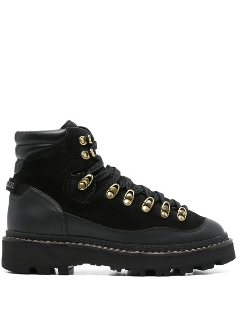 black calf leather suede panels front lace-up fastening logo pull-tab at the heel logo-debossed tongue round toe padded ankle branded insole Vibram® sole ankle-length