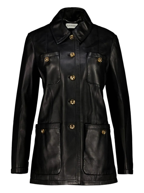 black lamb leather buttoned front flap pockets gold-tone buttons shirt collar