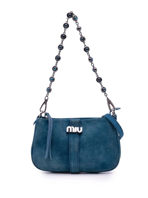 suede leather body silver-tone shoulder strap with gems detachable and adjustable flat leather strap top zip closure interior slip pocket blue Inclusions: shoulder strap. Condition: GOOD. This previously owned and used item is in good condition with minimal signs of use. This may include fading of material or plating and scratches. Please refer to the photos on this product page for a detailed view of the item, including any damages declared.