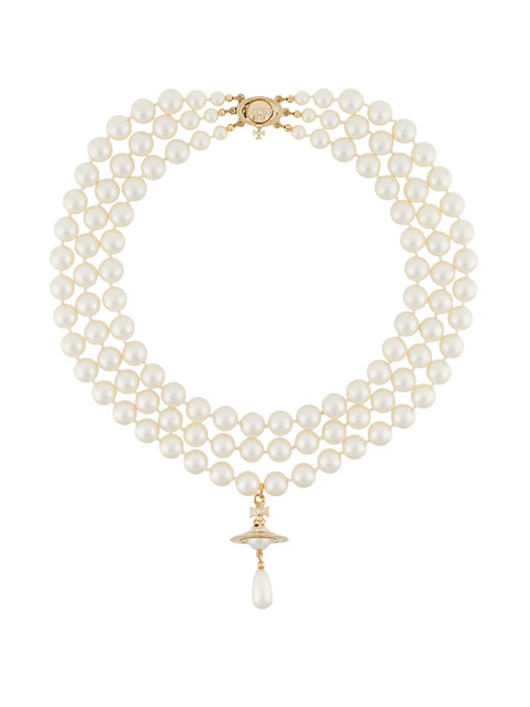 Gold-plated brass layered pearl necklace from Vivienne Westwood featuring an orb pendant and a clasp fastening.