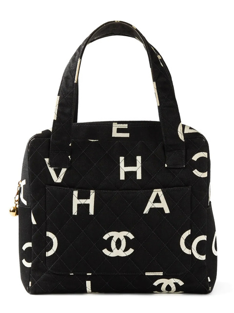 Black and white cotton logo print canvas handbag from Chanel Pre-Owned featuring a gold-tone top zip fastening, a quilted effect, top handles, a front slip pocket, a back slip pocket, a leather lining, an internal zipped pocket, an internal logo stamp and a gold-tone round charm. Circa 1996-7. Please note that pre-owned items are not new and therefore might have minor imperfections.