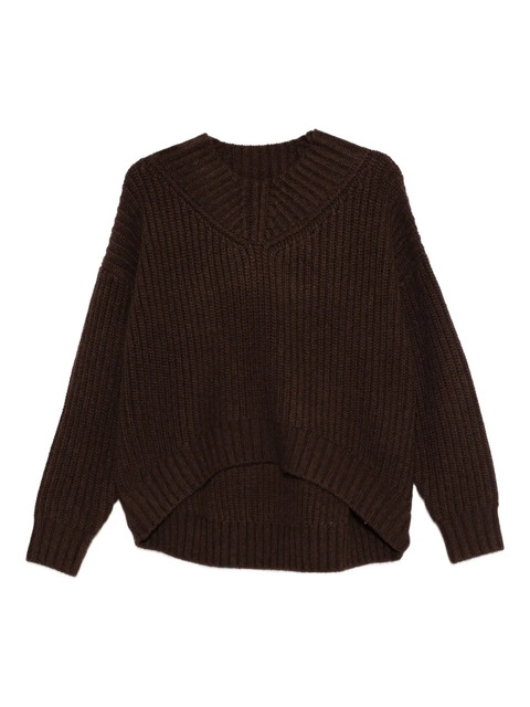 brown ribbed knit V-neck high neckline dropped hem long sleeves