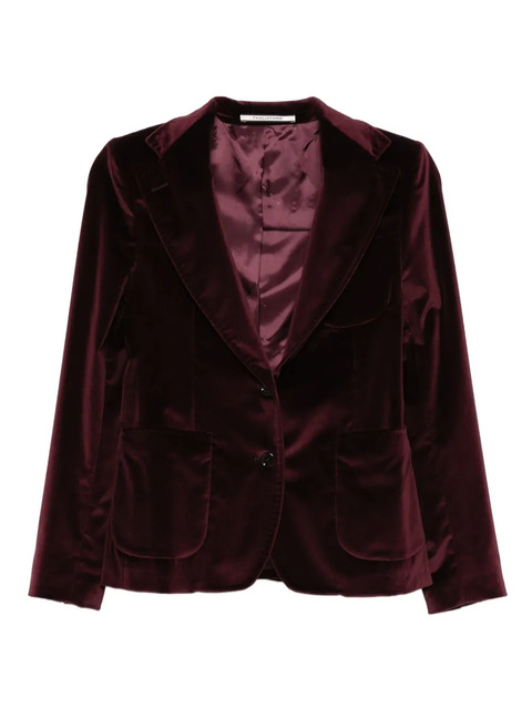 burgundy red velvet texture notched lapels two patch pockets button fastening long sleeves