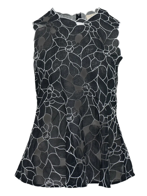 black cotton floral motif cut-out detailing crew neck sleeveless