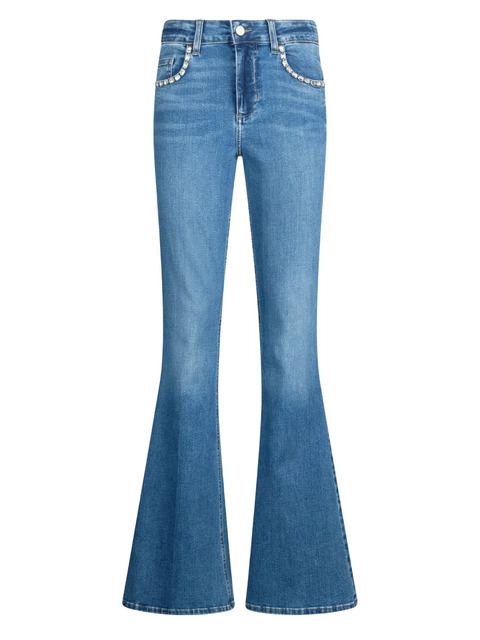 blue flared leg five-pocket styling rhinestone embellishment zip fly button closure